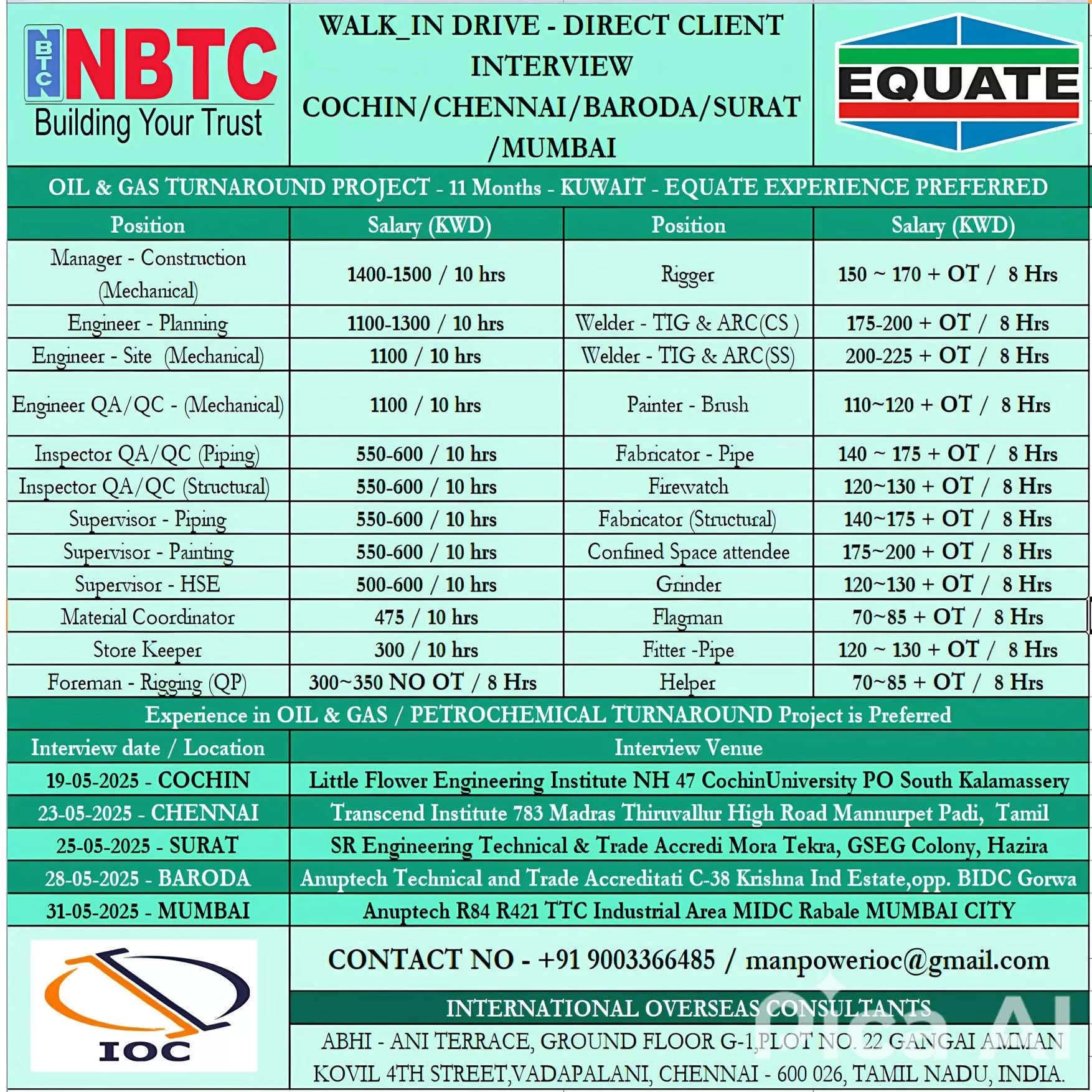 OIL & GAS TURNAROUND PROJECT – 11 Months – KUWAIT – EQUATE EXPERIENCE PREFERRED