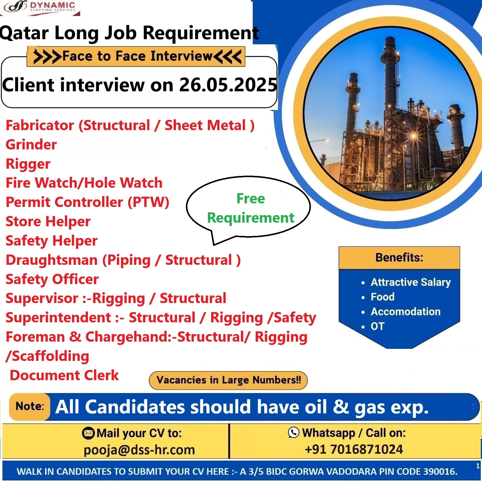 WALK IN CANDIDATES TO SUBMIT YOUR CV HERE :- A 3/5 BIDC GORWA VADODARA PIN CODE 390016.