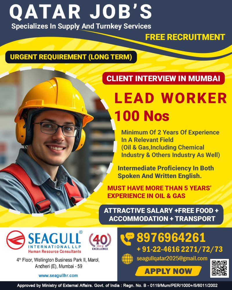 Qatar Jobs Free Recruitment for lead worker CLIENT INTERVIEW IN MUMBAI Minimum Of 2 Years Of Experience