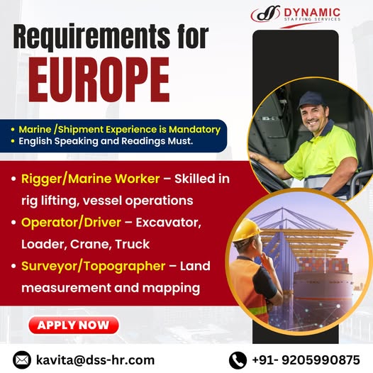 Requirement for Europe in Dynamic Staffing Marine /Shipment Experience is Mandatory English Speaking and Readings Must Rigger/Marine Worker – Skilled in rig lifting, vessel operations Operator/Driver – Excavator, Loader, Crane, Truck Surveyor/Topographer – Land