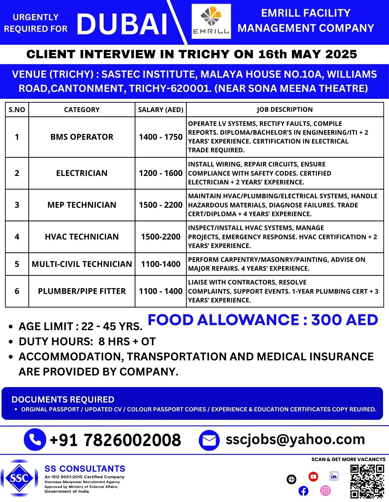 Facility Management Jobs, Trichy Jobs 2025, Overseas Jobs UAE, BMS Operator Vacancy, Electrician Jobs, MEP Technician Careers, HVAC Technician Salary AED, Plumber Jobs in Trichy, SS Consultants Recruitment, Urgent Hiring in Tamil Nadu, Government-Approved Recruitment.