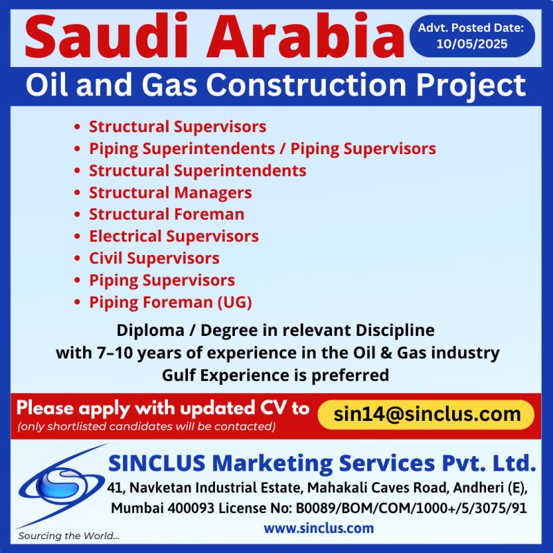 Oil and Gas Construction Project Job in Saudi Arabia for structural supervisor, piping superintendents piping supervisors, structural superintendents, structural managers in sinclus consultancy.