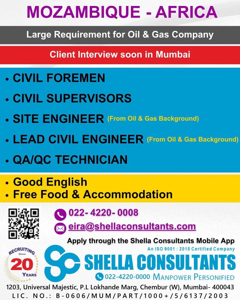 JOBS IN MOZAMBIQUE AFRICA FOR INDIANS, JOB VACANCY FOR CIVIL FOREMAN, CIVIL SUPERVISOR SITE ENGINEER LEAS CIVIL ENGINEER QA/QC TECHNICIAN CONTACT 022-4220-0008 [email protected]