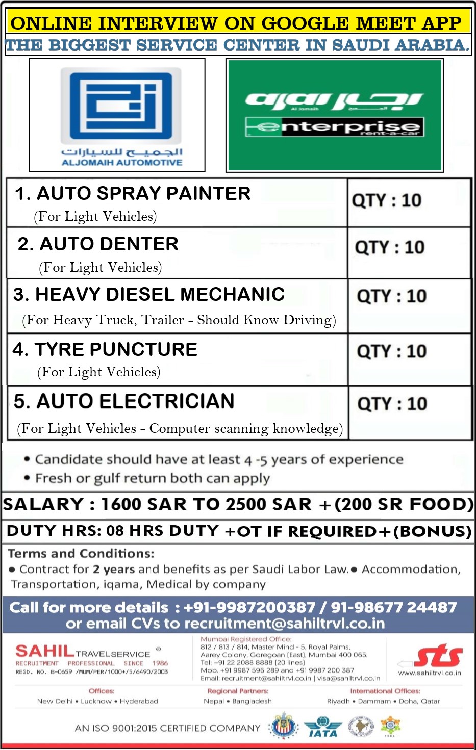 1. AUTO SPRAY PAINTER 2. AUTO DENTER 3. AUTO ELECTRICIAN 4. TYER PUNCHER 5. DIESEL MECHANIC Apply on Email Apply on WhatsApp