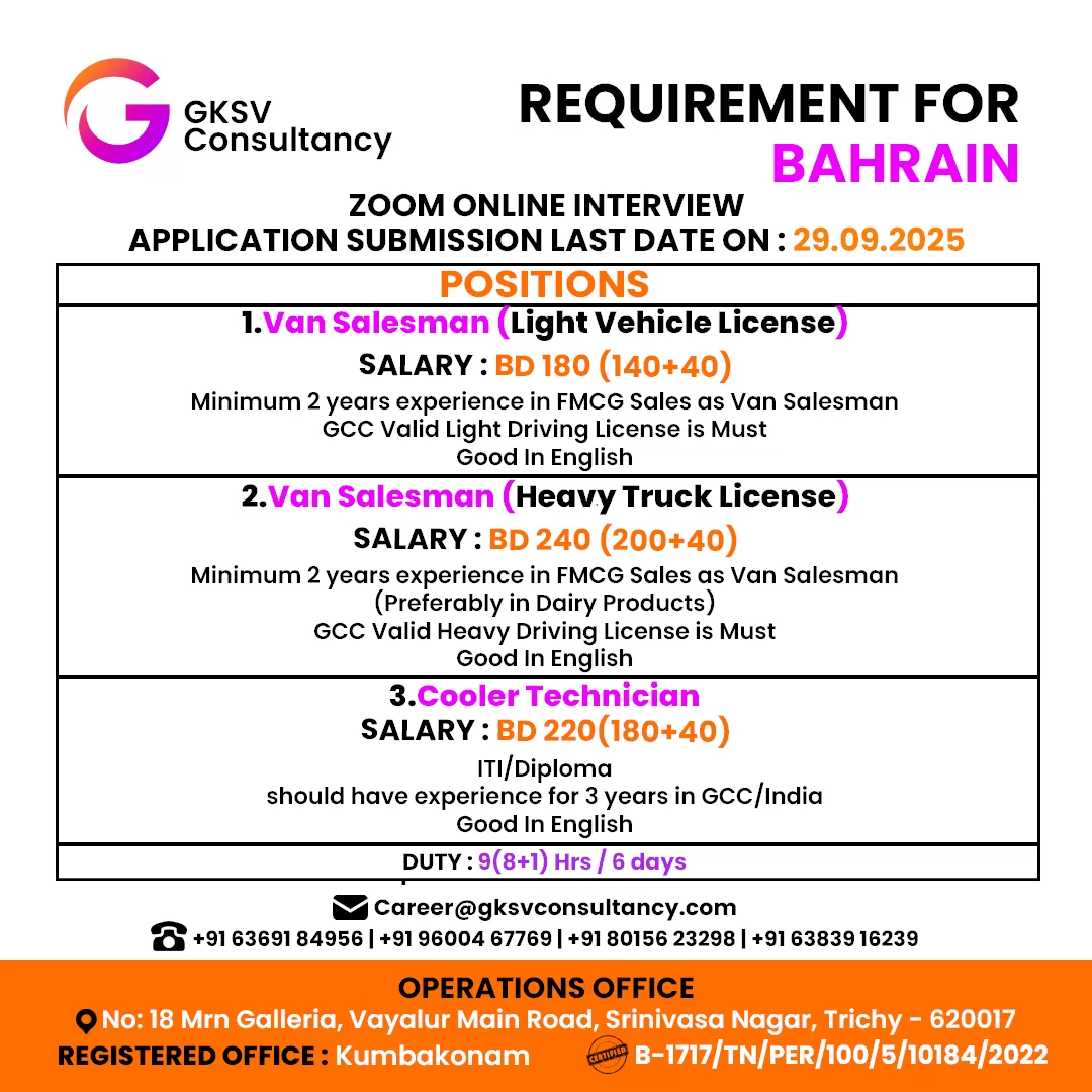 #vansalesman #lightvehiclelicense #heavytrucklicense #FMCGSales #License #HeavyLicense #coolertechnician #ITIDiploma #diploma #gccindia #gccindia #bahrain #Bahrain2025 #bahrainjobs #Jobs #JobSearch #jobshiring #jobseekers #jobsearching