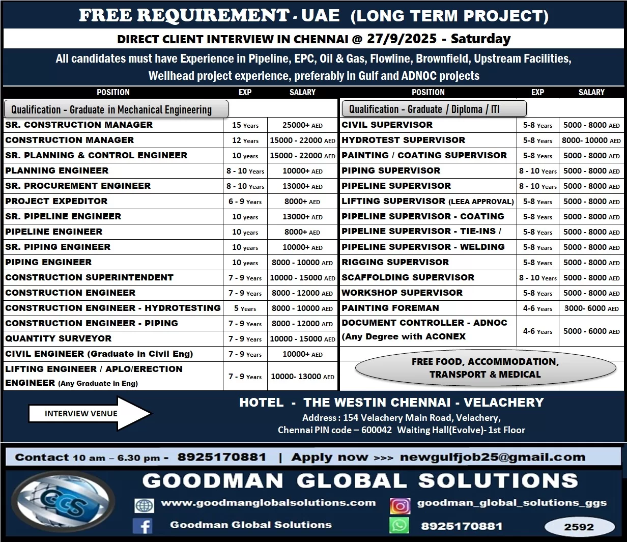 All candidates must have Experience in EPC, OIL AND GAS, FLOWLINE, BROWNFIELD, UPSTREAM FACILITIES, wellheld project experience, preferably in Gulf and ADNOC projects