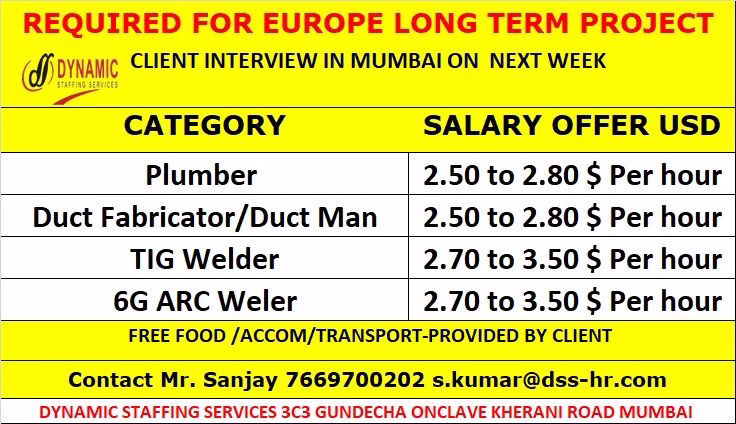 Duct man Duct Fabricator Jobs in Europe | Dynamic Staffing Services Job Vacancies for Plumber Duct man Duct fabricator tig welder arc welder client interview in mumbai on next week send your cv to [email protected] 7669700202