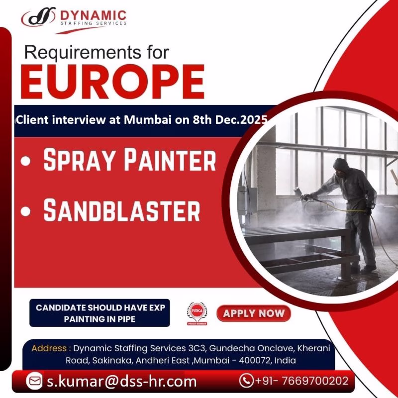 Spray painter sandblaster requirement for Europe | Dynamic Staffing Services candidate should have exp in painting in pipe send your cv to [email protected] +917669700202