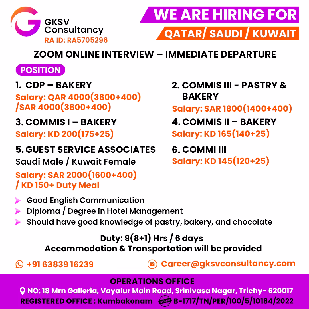 Salary: SAR 2000(1600+400) / KD 150+ duty Meal