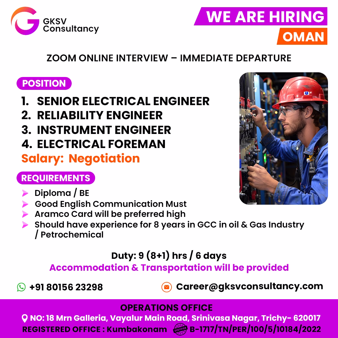 Should have experience for 8 years in GCC in oil & Gas Industry / Petrochemical