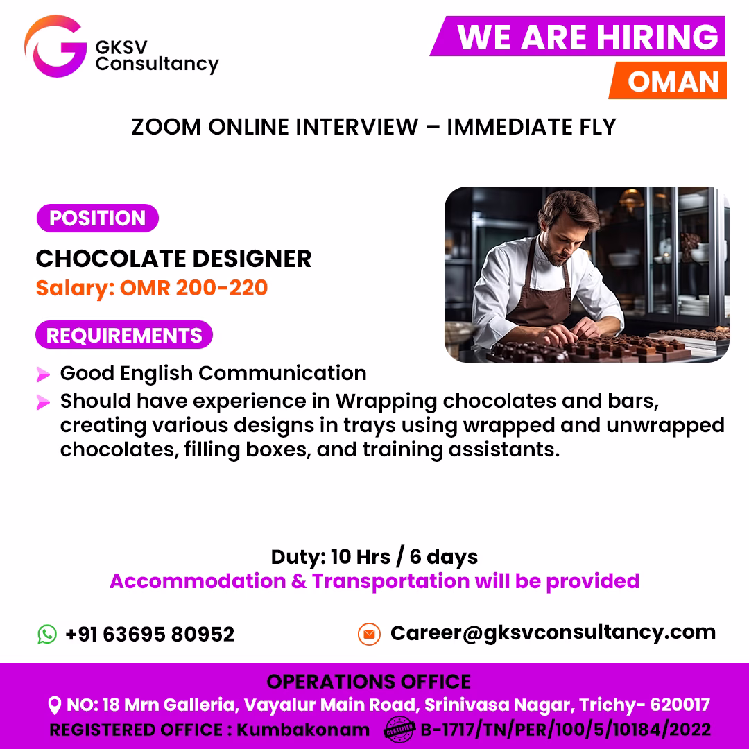 Should have experience in Wrapping chocolates and bars, creating various designs in trays using wrapped and unwrapped chocolates, filling boxes, and training assistants.