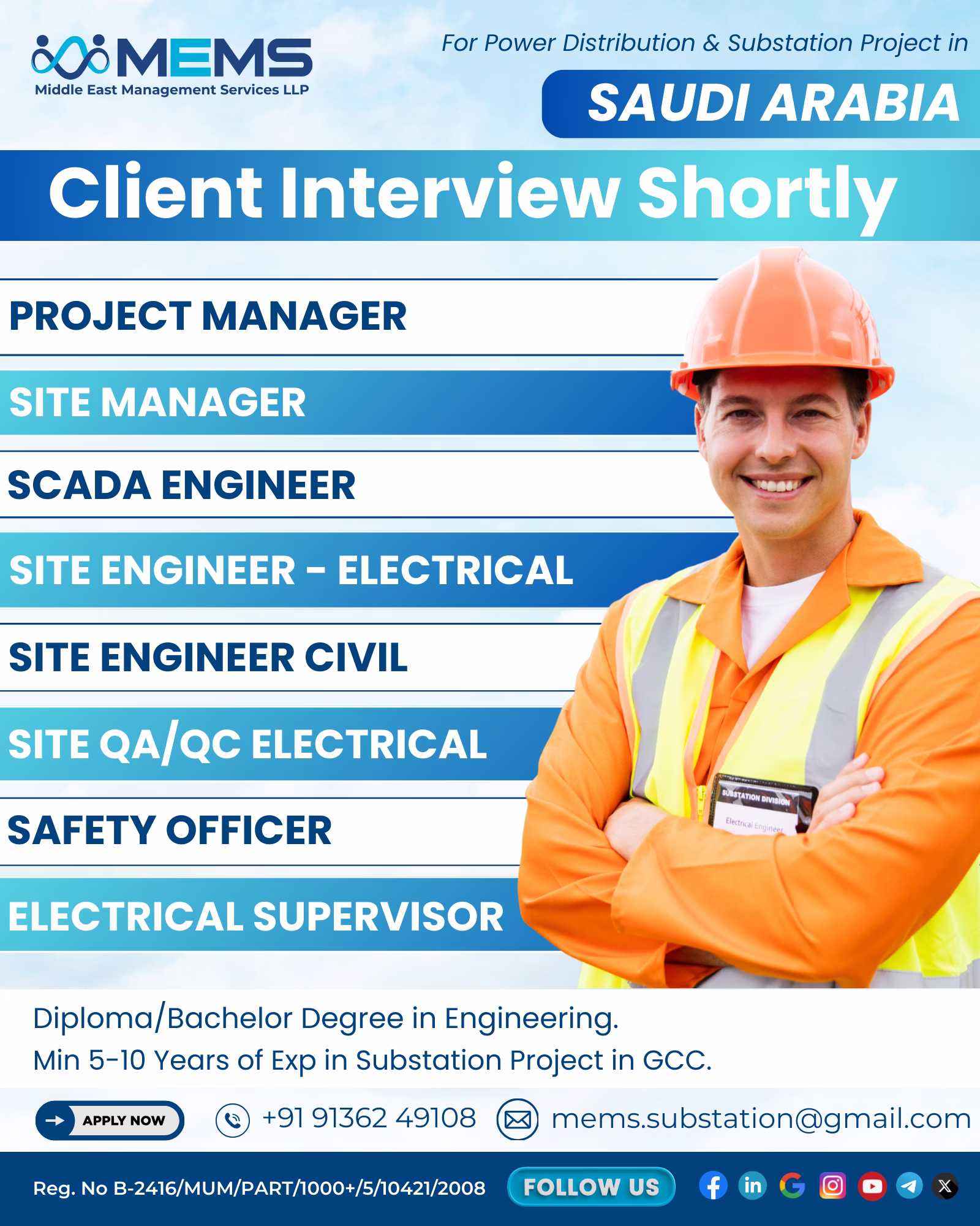 #MEMSLLP #SaudiArabiaJobs #GCCJobs #SubstationProjects #PowerDistribution #EngineeringJobs #ElectricalEngineer #CivilEngineer #SCADAEngineer #ProjectManagerJobs #SiteEngineerJobs #SafetyOfficer #ElectricalSupervisor #OverseasJobs #GulfJobs #HiringNow #ClientInterview #JobsInSaudiArabia #RecruitmentAgency #MumbaiJobs