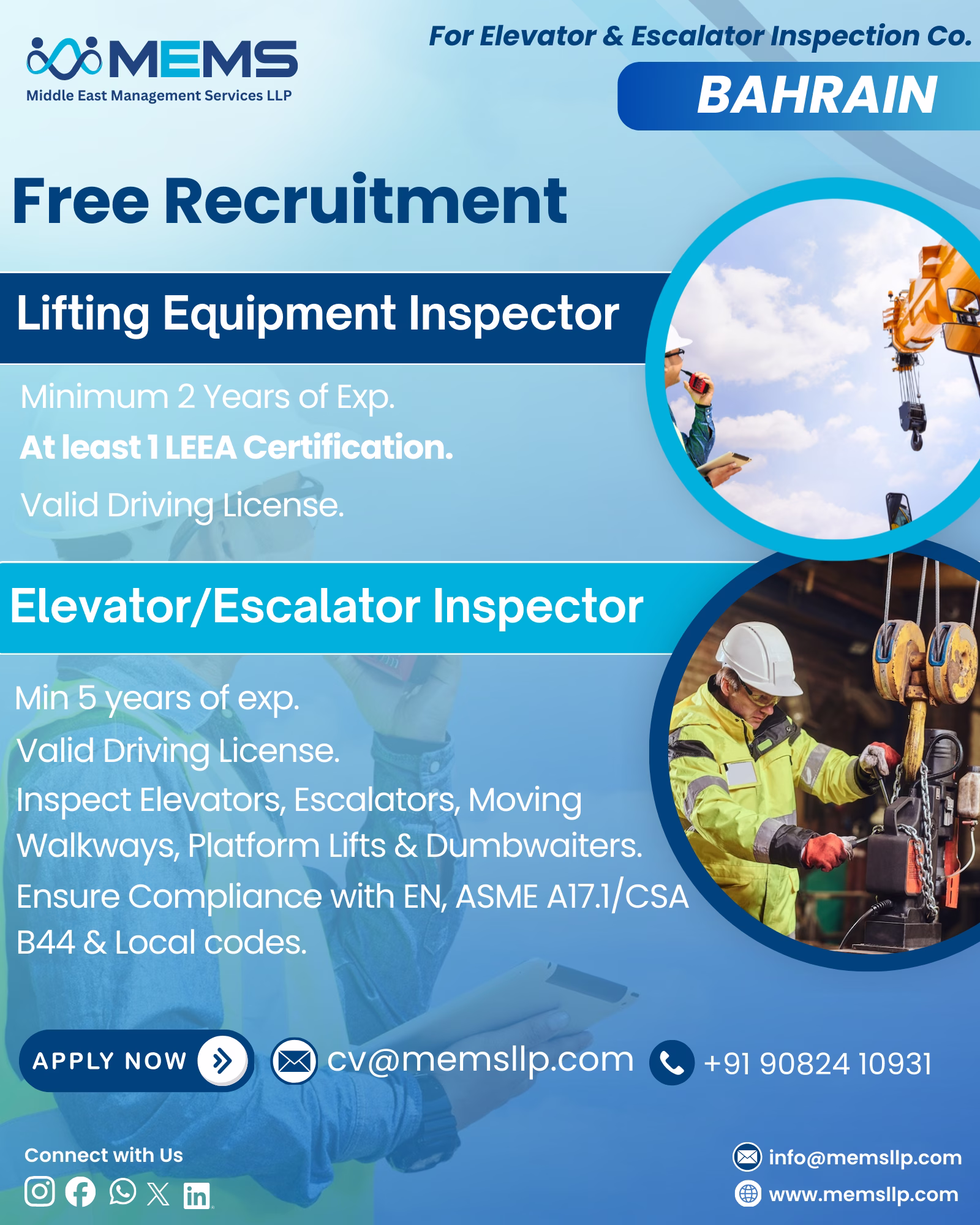 #bahrainjobs #overseasjobs #gulfjobs #elevatorinspector #escalatorinspector #liftingequipmentinspector #engineeringjobs #inspectionjobs #middleeastjobs #jobopportunity #memsllp #freerecruitment #applynow